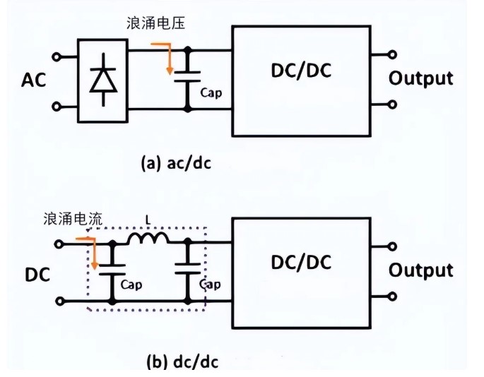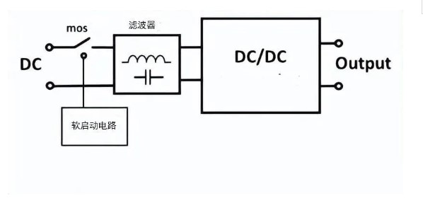 为了降低输入/输出的纹波噪声或EMI噪声,现在通常是在输入侧并联电容或者滤波器,如下所示。由于滤波器中有电容,当系统开始上电时,由于输入电压的快速上升,会产生很高的浪涌电流。这种情况可能会导致前端电源供电不足,或者触发过流保护,导致无电压输出,因此,浪涌电流的抑制变得越来越重要。