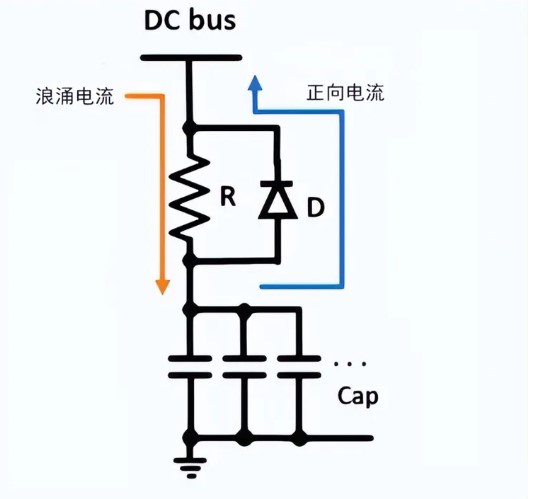 如下所示,主要用于应用电路需要外接大量电容时。如果没有外部限流电路,直流母线电压开启时会产生很大的浪涌电压,可能导致前端电源压降进入保护模式。此时,只需在电容输入串联电阻和二极管即可,可以减轻浪涌电流。当直流母线通过电阻给电容充电时,可以限制浪涌电流,但是,当直流母线需要供电时,电容可以通过二极管将电能反馈给直流母线。
