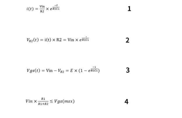 从MOS管特性描述来看,欧姆模式最适合抑制浪涌电流。至于R1、R2、C1的计算,可以用下面的公式: