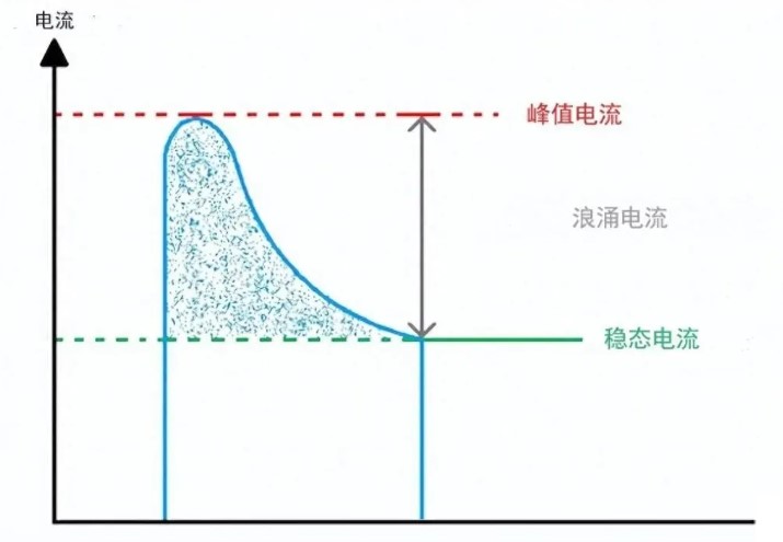 下面的图可以看到浪涌电流、峰值电流和稳态电流之间的差异: