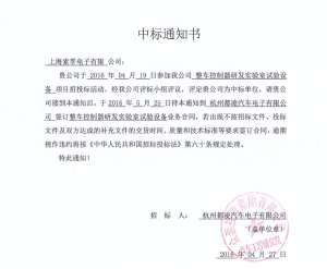 我司于2016年04月19日参加众泰控股集团整车控制器研发实验室试验设备项目招标活动,经众泰控股集团评标小组评定我司为中标单位。
