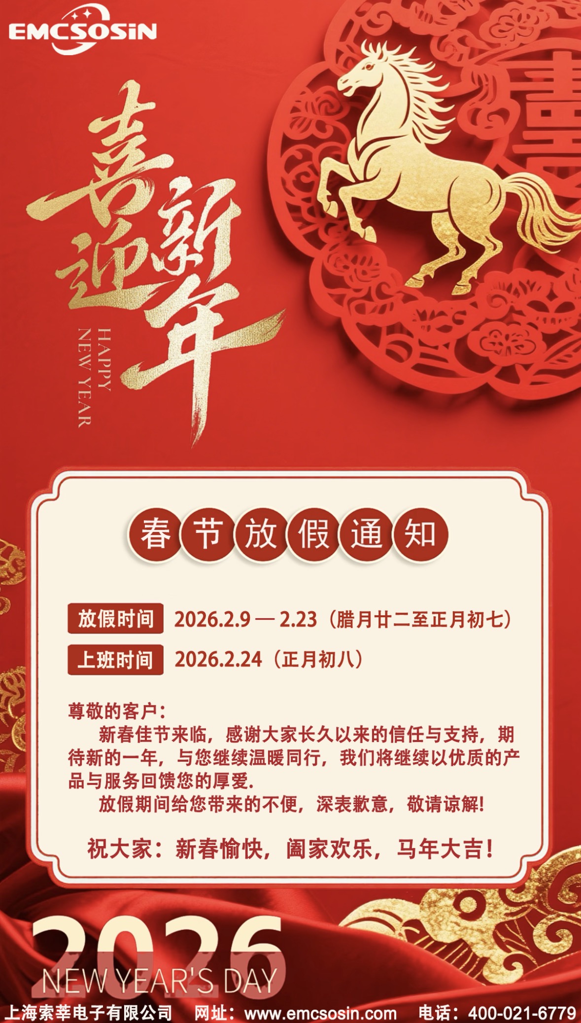 2026新春佳节即将来临,为欢度中华民族的传统佳节,结合公司实际情况,经公司研究决定现就 2026年春节放假安排如下: